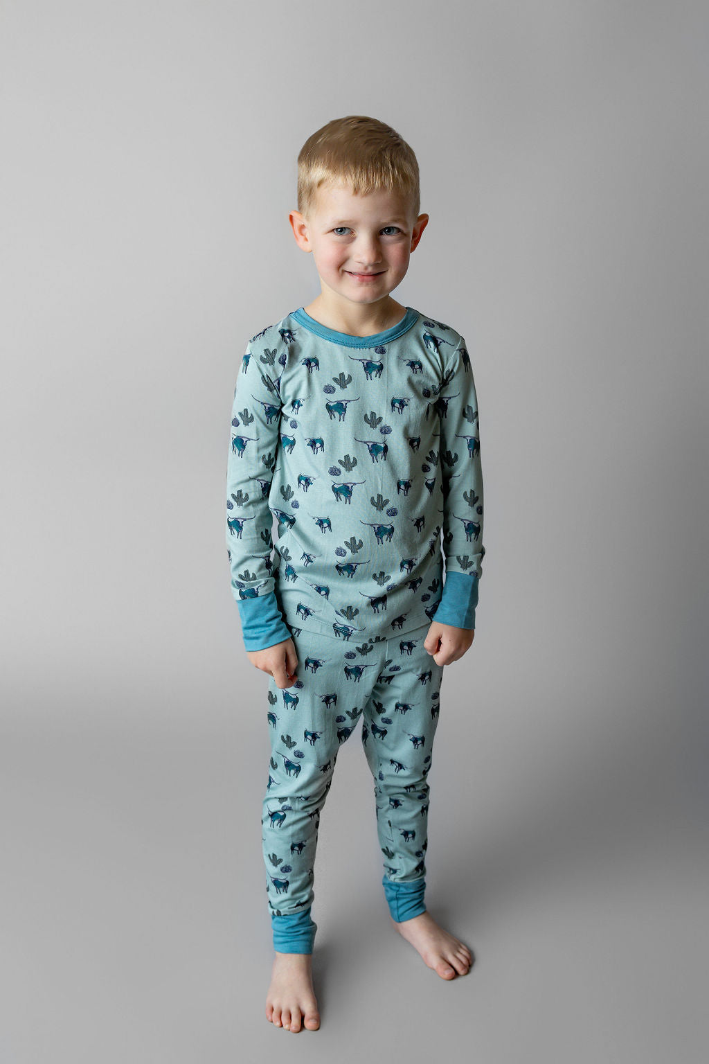 Saddle up for sweet dreams with our Cattle Drive Long Sleeve Pajama Set — a bold, western-inspired print featuring patchwork-style longhorns and hand-drawn desert flora. With rich teal, navy, and sage tones set against a dusty blue backdrop, this design brings a playful yet rustic charm perfect for your little wild one’s bedtime adventures.